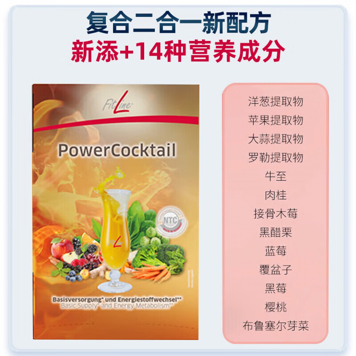 成分:果糖,阿拉伯胶,燕麦纤维,豌豆纤维,天然香料,增稠剂(瓜尔胶、果胶),酸度调节剂(柠檬酸),瓜拉纳萃取物粉末(麦芽糊精、咖啡因、瓜拉纳萃取物),β-胡萝卜素,维生素C,甜菜粉(甜菜汁浓缩物、麦芽糊精、酸度调节剂(柠檬酸)),苹果纤维,乳酸菌(嗜酸乳杆菌、洛氏乳杆菌),凤梨粉(麦芽糊精、凤梨果泥浓缩物),菊粉,水果、蔬菜和香料混合物(蔓越莓粉、石榴萃取、苹果萃取、针叶樱桃萃取、西兰花芽粉、草莓粉、番茄粉、绿花椰菜、酸樱桃粉、姜黄粉、菠菜粉、罗勒粉、牛至粉、肉桂粉、接骨木果粉、胡萝卜粉、黑莓粉、黑加仑萃取物、甜菜粉、蓝莓粉、覆盆子粉、抱子甘蓝粉),维生素E,烟碱酸,与γ-环糊精结合的姜黄萃取物,甜味剂(来自甜菊糖的甜菊苷),富硒酵母,泛酸,海藻粉(泡叶藻),维生素B6,姜萃取物粉(姜萃取物、麦芽糊精),维生素B1,维生素B2,维生素B12,葡萄籽萃取物,叶酸,生物素。