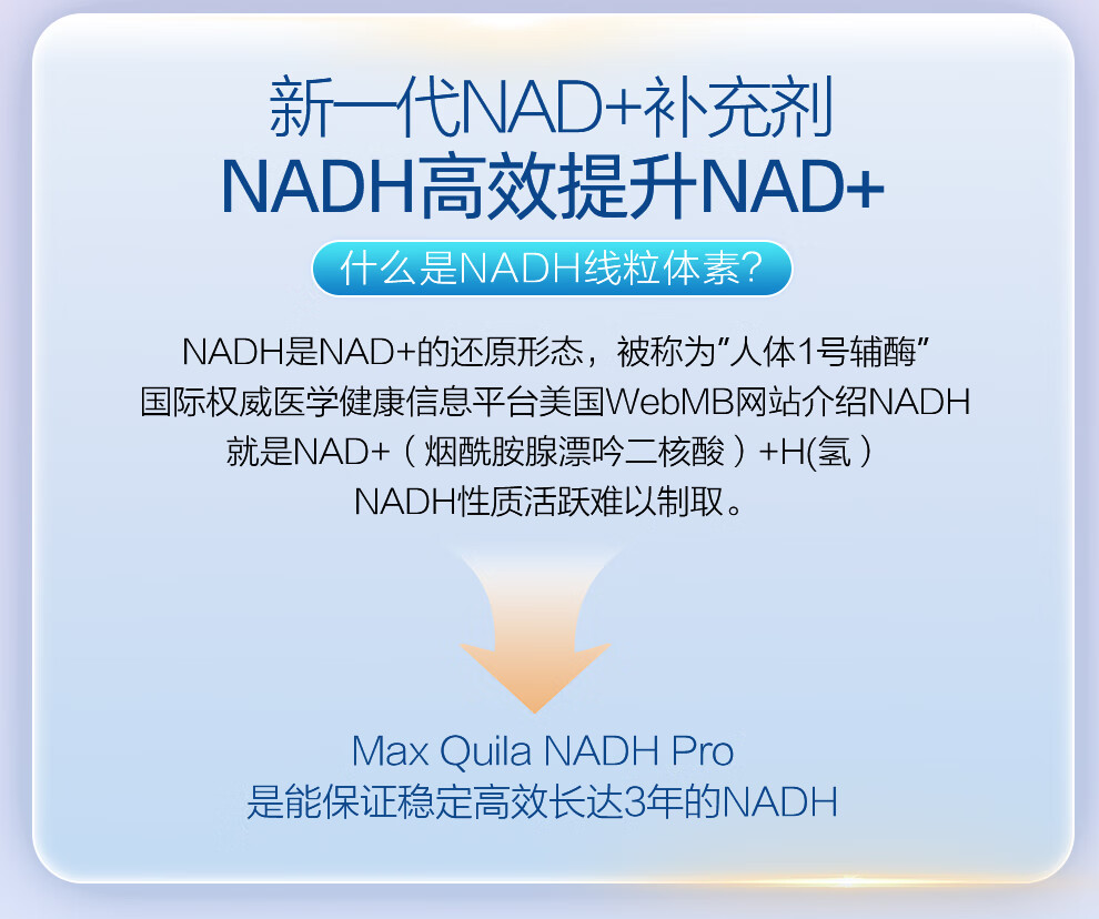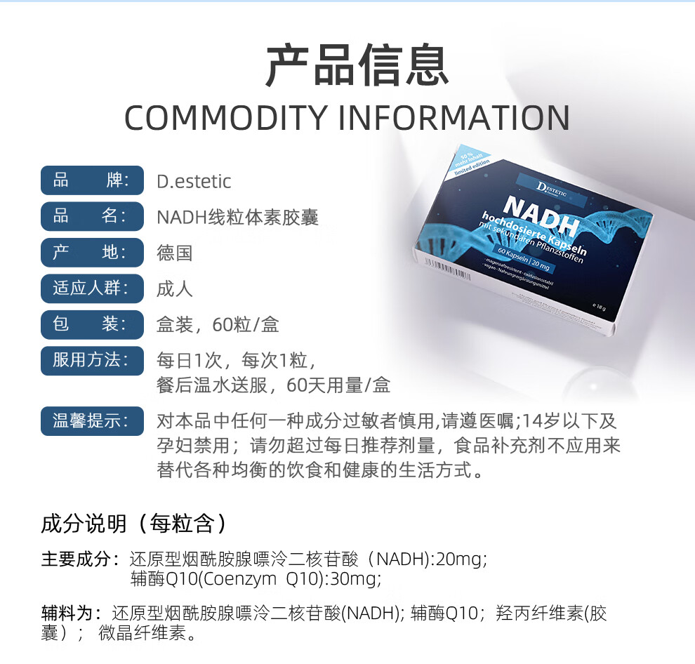其他成分:辅酶Q10:30 mg;烟酰胺腺嘌呤二核苷酸 (NADH):20 mg。