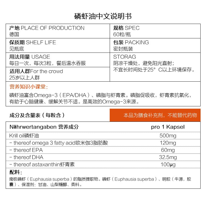 商品名称:德国进口zeinpharma纯南极磷虾油磷脂深海鱼油升级42%磷脂型高纯度Omega-3虾青素 60粒