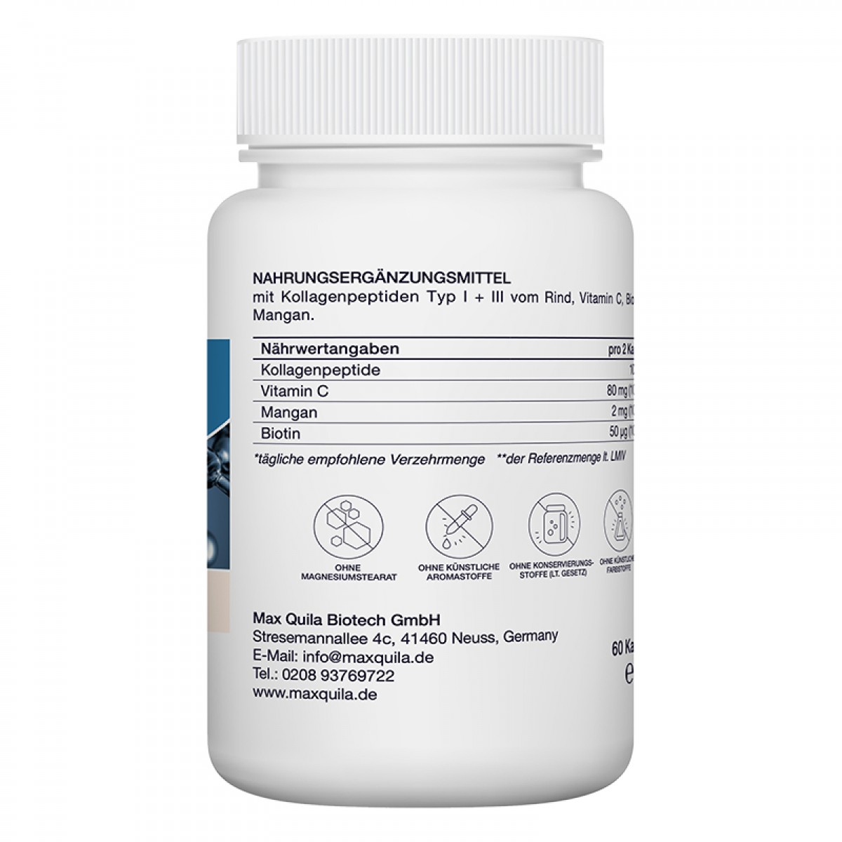 胶原蛋白肽(Verisol B)、羟丙基甲基纤维素 (胶囊)、抗坏血酸(维生素C)、抗氧化剂:抗坏血酸棕榈酸酯、葡萄糖酸锰(锰)、生物素(维生素B7)。