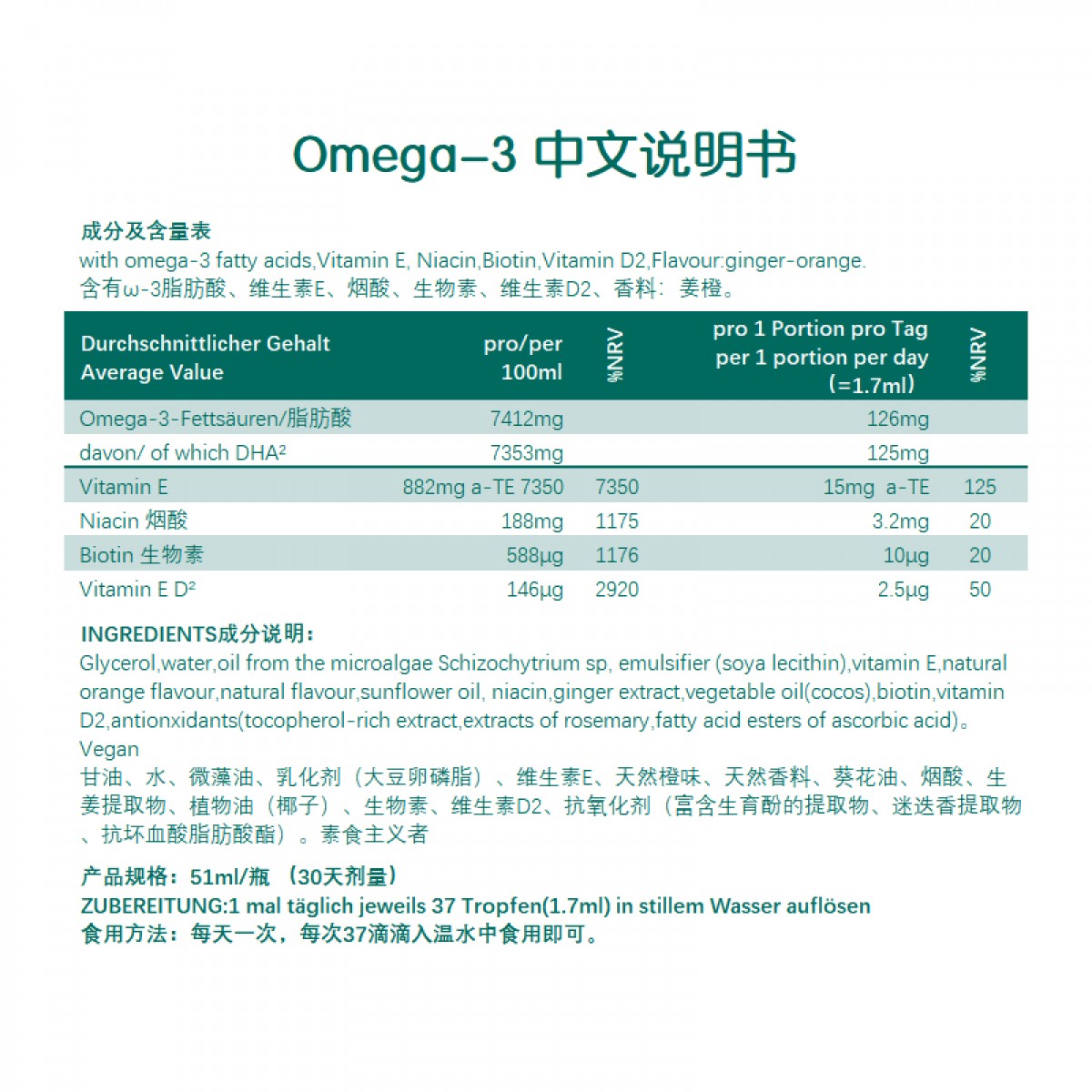 甘油、水、微藻油裂殖壶菌属、乳化剂(大豆卵磷脂)、维生素E、天然柳橙香料、天然香料、葵花油、烟碱酸、生姜萃取物、植物油(椰子油)、生物素、维生素D2、抗氧化剂(富含生育酚的萃取物、迷迭香、抗坏血酸脂肪酸酯)。 口味:姜橙味