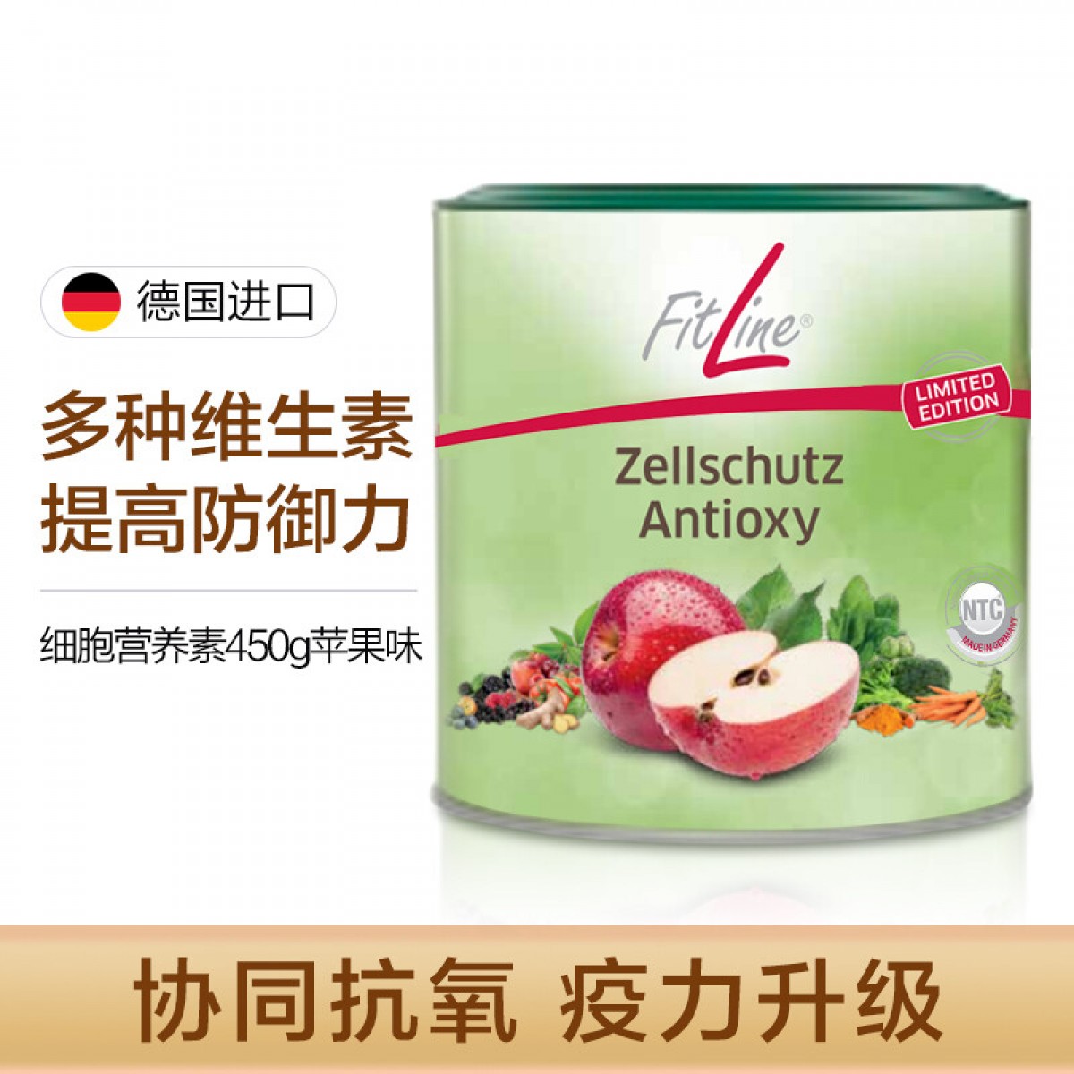 商品名称:FitLine德国进口PM菲莱细胞营养素抗氧化复合维生素VC+E增强提升自护免疫 【细胞抗氧素】美人粉青苹果味450g