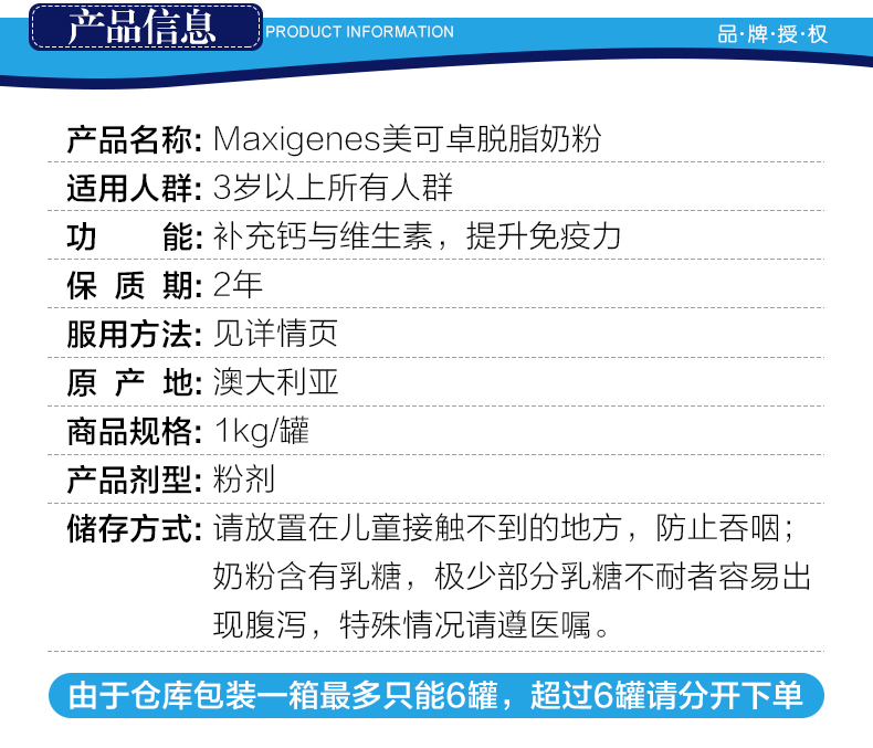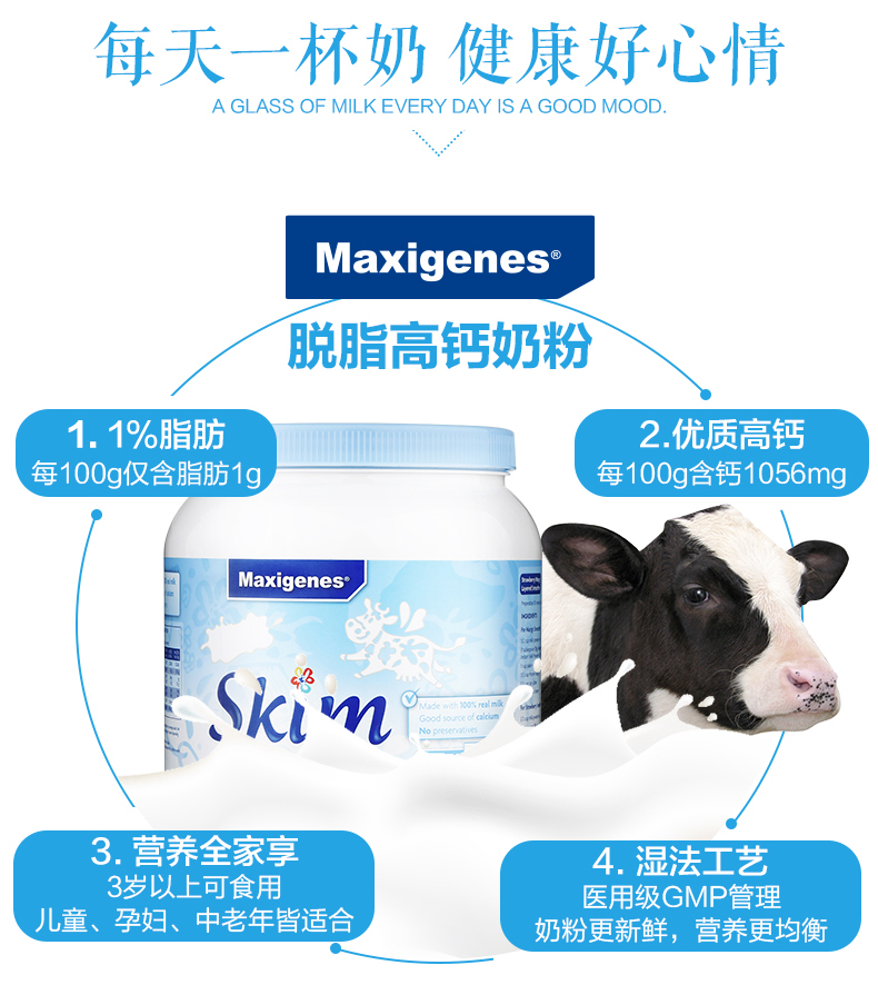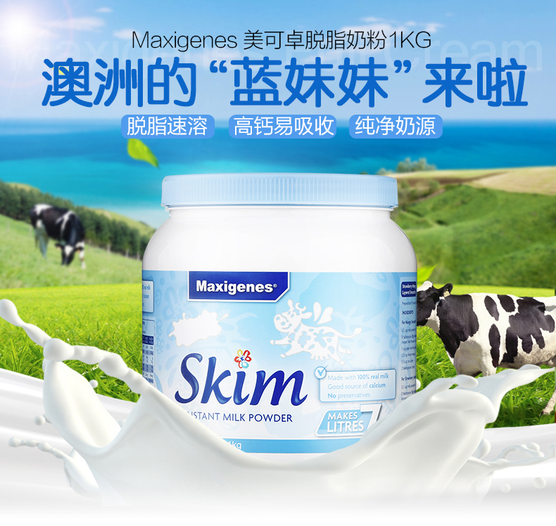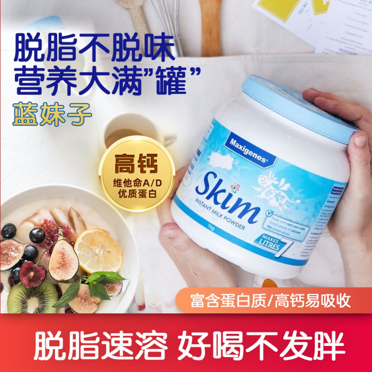 商品名称:Maxigenes美可卓蓝妹子脱脂成人奶粉1kg罐0蔗糖高钙儿童学生中老年